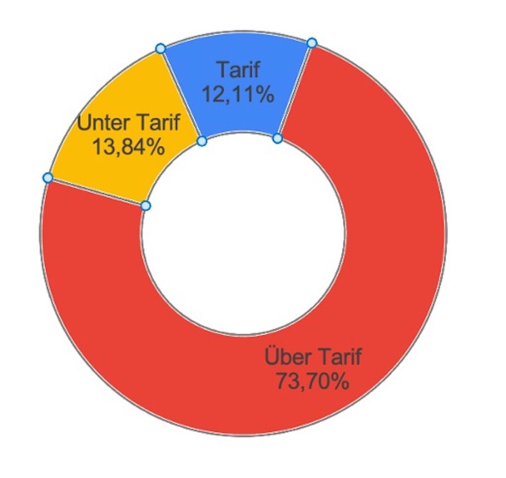 Auf der anderen Seite gaben aber auch 6,23 % an, den Tariflohn um mehr als 20% zu unterschreiten. Sieht man sich die Stundenlöhne in zahlreichen Tarifklassen an, wird deutlich, dass eine Vergütung 20% unterhalb dieser Stundenlöhne den auch für ZFA´s geltenden Mindestlohn von 12,-€ pro Stunde nicht erreicht. Hier ist definitiv Handlungsbedarf gegeben.